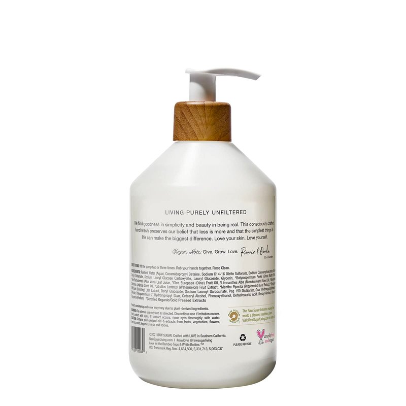 Made with plant-derived ingredients and cold pressed extracts for total skin hydration. Vegan. Cold press so. pure cal. technology. Free of sulfates & parabens. Living Purely Unfiltered: We find goodness in simplicity and beauty in being real. This consciously crafted hand wash preserves our belief that less is more and that the simplest things in life can make the biggest difference. Love yourself. Sugar Note: Give. Grow. Love. Ronnie & Donda Co-Founders. Product consistency and color may vary due to plant-derived ingredients. www.RawSugarLiving.com. (hashtag)rawlovin. (at)rawsugarliving. Raw Sugar Initiative: The Raw Sugar Initiative makes the world a cleaner, healthier place. Visit RawSugarLiving.com to learn more. Look for the bamboo tops & white bottles. Please recycle. Cruelty free and vegan. Crafted with love in Southern California.