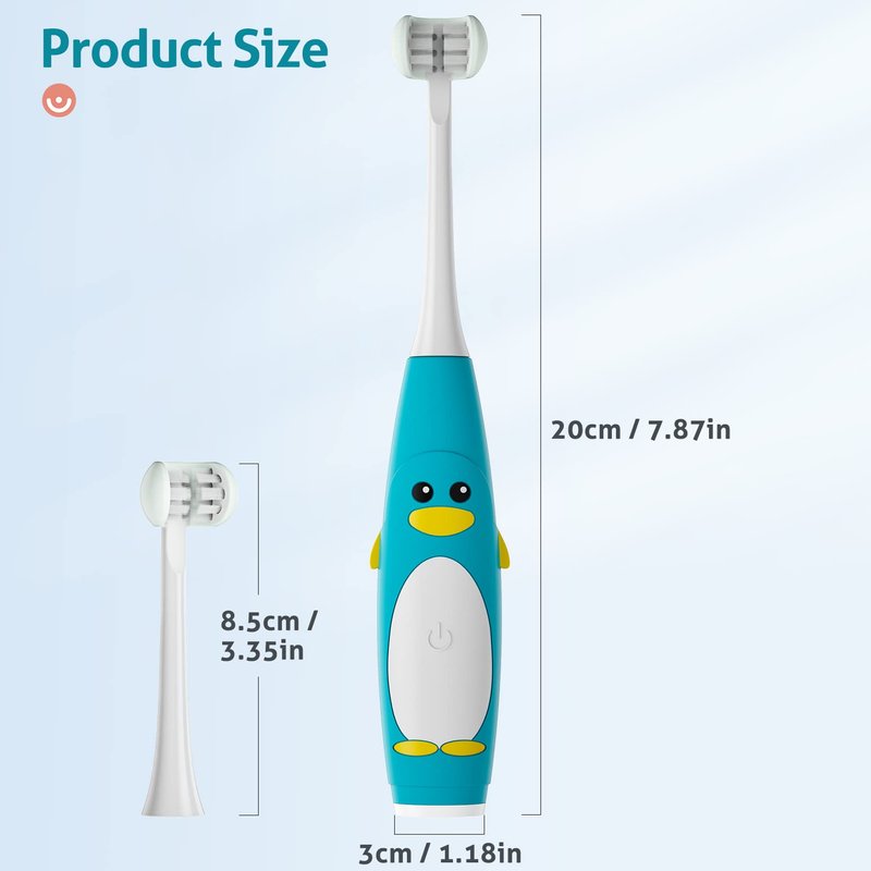 - 5 Adjustable Modes & Smart Timer: Our 3 sides kids toothbrush has 5 different operating frequencies, 28000VPM-32000VPM. Built in timer, with 2 minutes automatic shutdown function, Small vibrations in the process to remind kids to change the brushing area each 30 seconds.