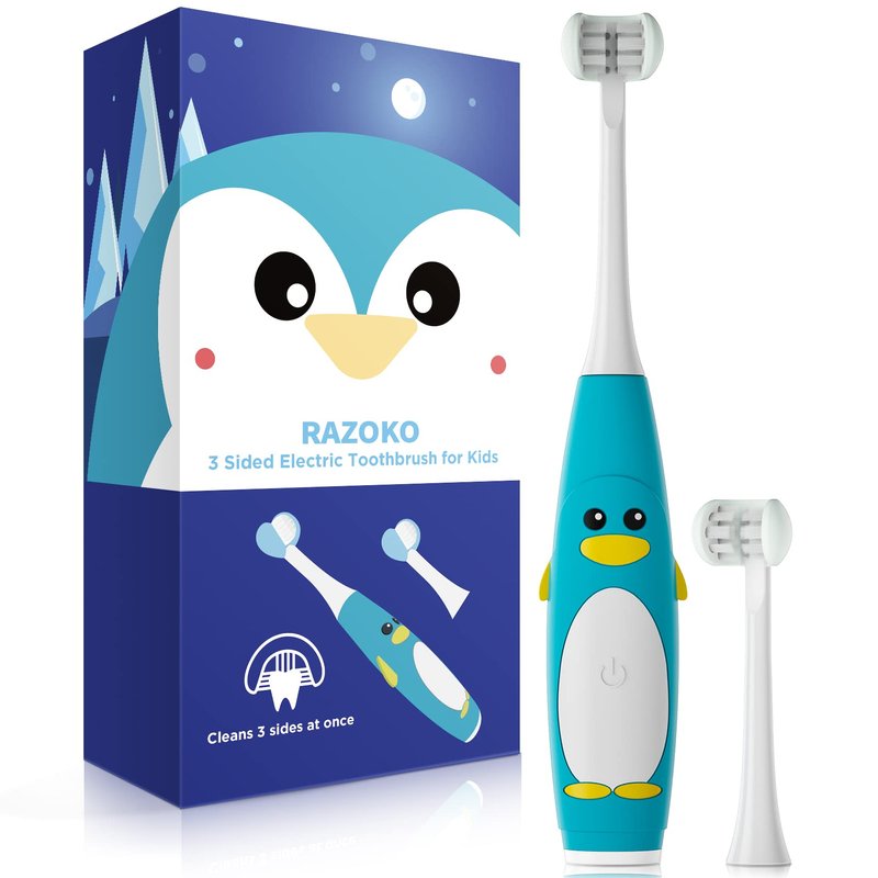 RAZOKO Kids Electric Toothbrush 3 Sided Toothbrush,Sonic Toddler Toothbrush with 2 Brush Heads, Intelligent Timer 5 Gears Adjustment,Ipx7 Waterproof,USB Cable