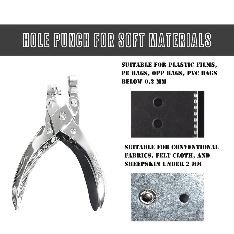 - *Versatile hole punch: This small handheld tool is perfect for DIY craft projects and can punch holes in a variety of soft materials such as fabric, felt cloth, sheepskin leather, plastic film, and PE/OPP/PVC bags.