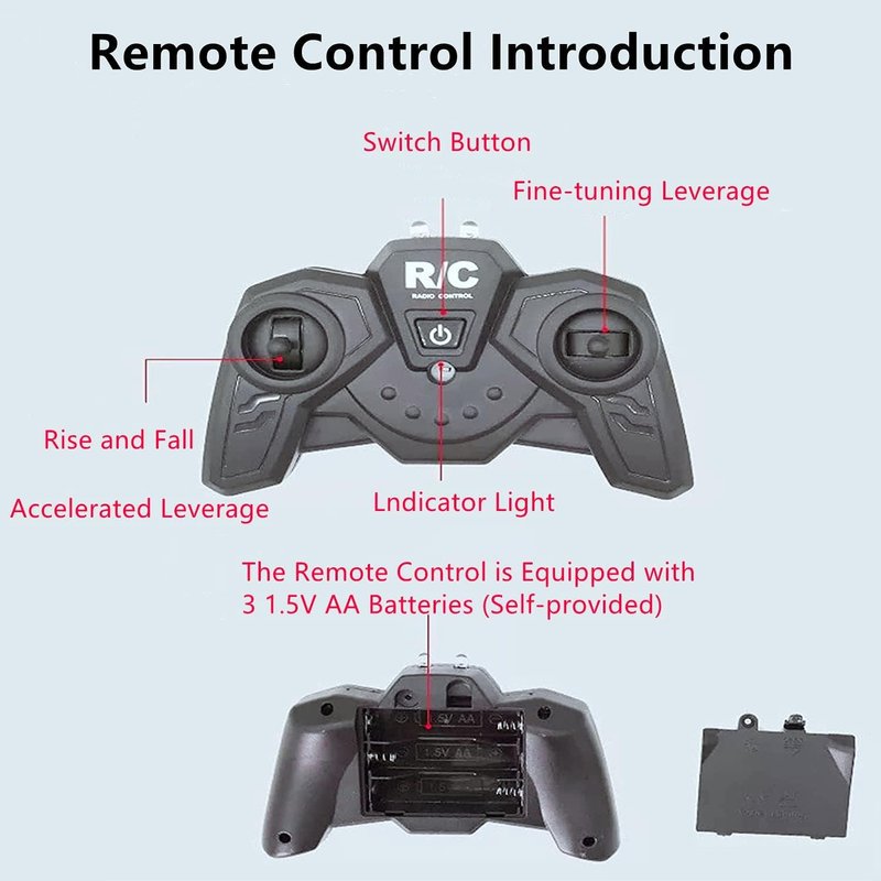 - Helicopter Remote Control: The remote control has the function of frequency pairing, turn on the switch on the bottom of the helicopter before using, turn on the remote control switch, push the left joystick up and then pull it down to complete the frequency pairing, control the take-off and landing, and the right joystick control the fuselage fine-tuning. The remote control requires 3 AA batteries. (Not Included)