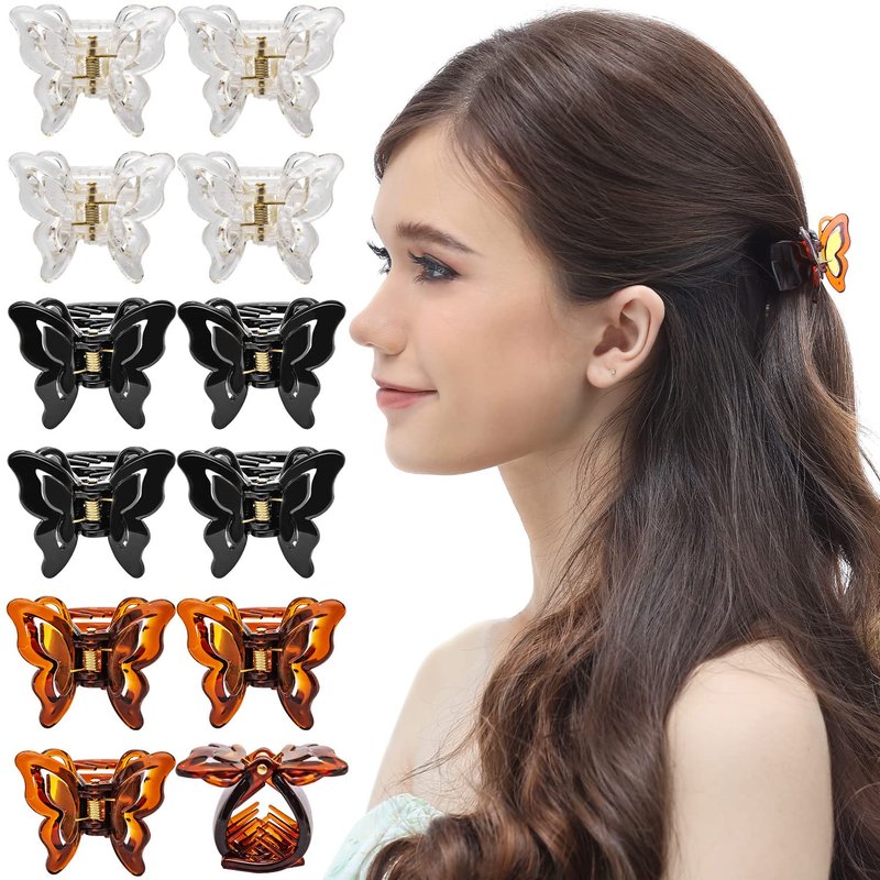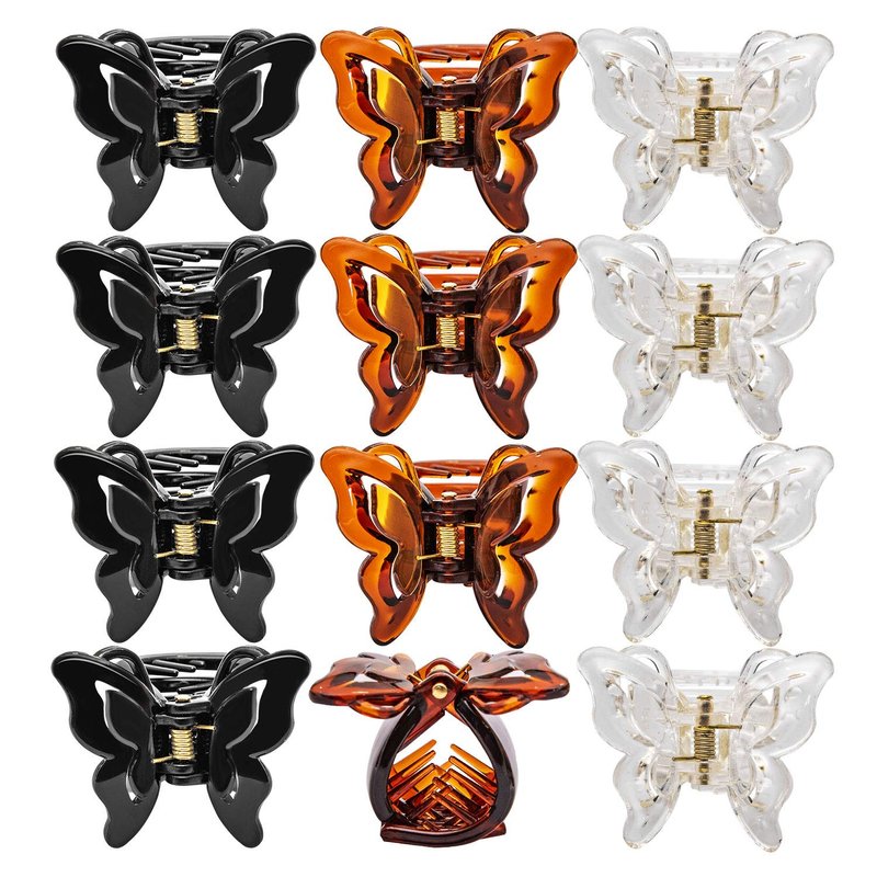 RC ROCHE ORNAMENT 12 Pcs Womens Cute Butterfly French Clutcher Claws Jaw Hair Clips Interlocking Teeth Strong Hold No Slip Grip Clamp Classic Beauty Fashion Accessory, Medium Clear Brown and Black