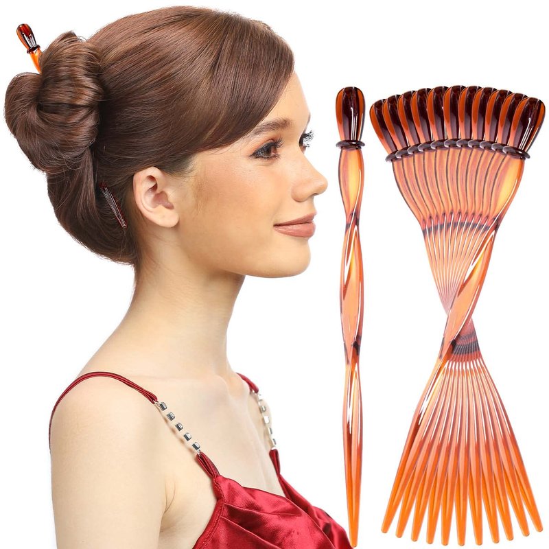 RC ROCHE ORNAMENT 12 Pcs Womens Premium Plastic Strong Hold Updo Chignon Bun Maker Long Spiral Hairpin Beauty Accessory Shawl Pin Fork Chopstick Hair Décor Pins Sticks, Medium Brown