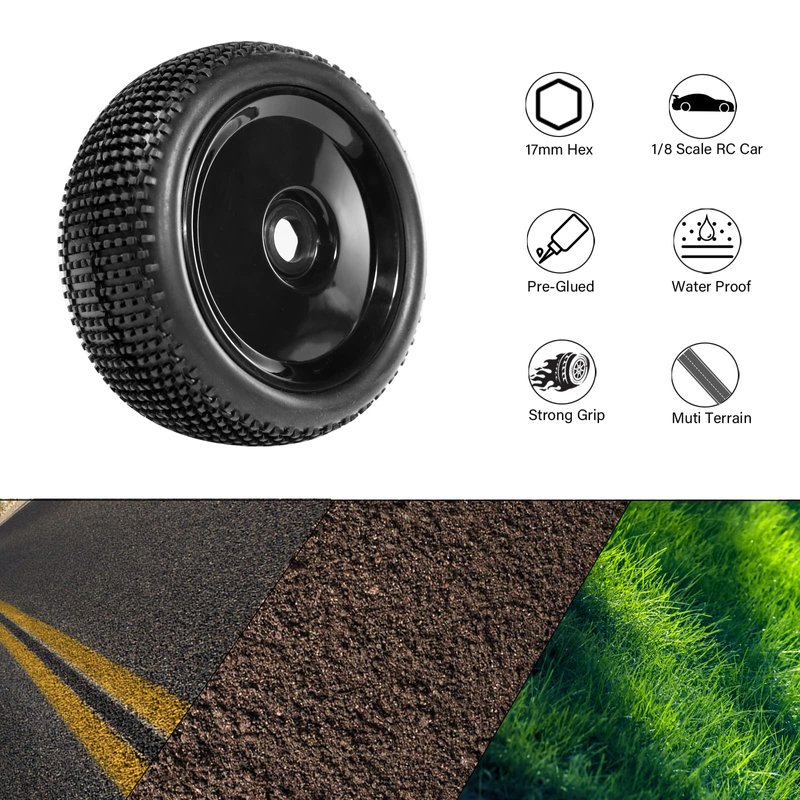 RC Station 4PCS Preglued 17mm hex Wheels and Tires 1/8 Scale RC Buggy RC Tires and Wheels with Foam Inserts 1/8 RC Buggy Tires and Wheels for Typhon, Redcat, Team, Losi, HPI, HPS, 4PCS-Black