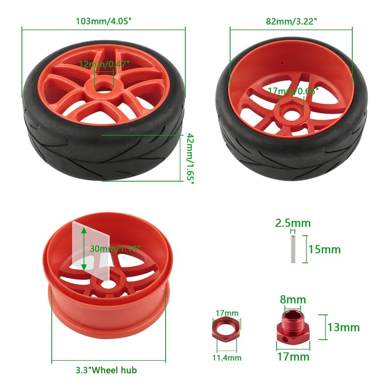 - Drive Hex Size: 17mm, Axle Diameter of the Adapter: 8mm, Wheel Hub Center Hole Dia: 12mm, Tire Width: 42mm(1.65''), Outer Diameter: 103mm(4.05''), Depth to the Hex Mount: 30mm