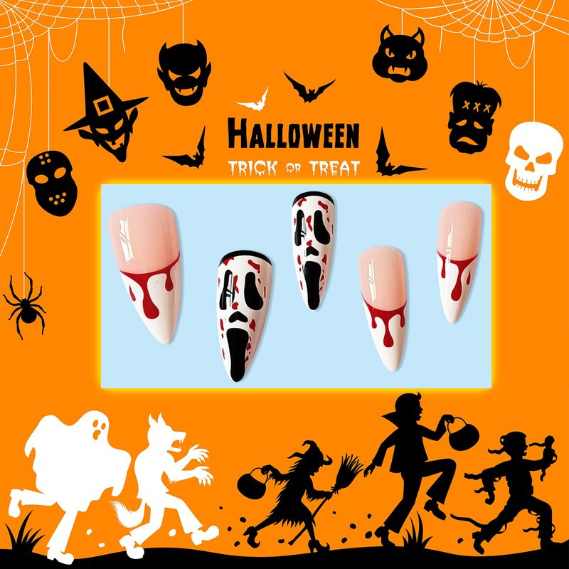 Rchovsam Halloween Scream Grimace Press on Nails White French Long Almond Fake Nails Bleed Design Glue on Nails Full Cover Gel Nails Kit for Womens 24pcs
