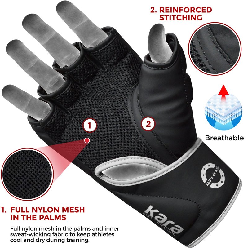 - EXPERIENCE UNMATCHED DURABILITY – RDX’s MMA gloves are your dependable training partner, offering unmatched durability when mastering the art of grappling and takedowns. These padded MMA gloves, constructed from rugged ConvEX Skin Maya Hide leather, are designed to endure and enhance your every punch and move. Whether you're preparing for an MMA bout, honing your Muay Thai skills, or practicing for any other combat sport, you deserve gear that's just as tough as you are.