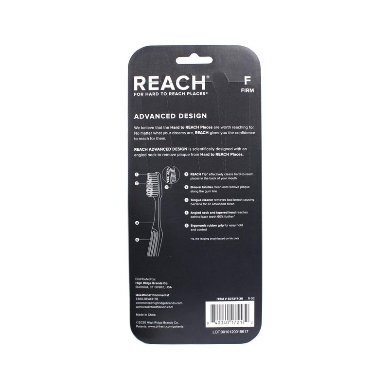 Reach Advanced design toothbrushes are scientifically designed with a signature angled neck and tapered head to clean hard to Reach places. These toothbrushes feature bi-level bristles to help clean and remove plaque between teeth and along the gum line. The signature angled neck extends behind back teeth 60% further than other leading brushes. Reach Advanced design toothbrushes also feature an ergonomic rubber grip for better comfort and control with brushing.