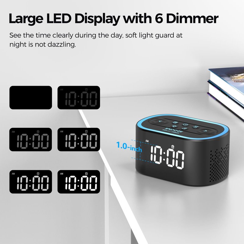 - Large LED Display with 6 Dimmer: Large white LED digits(1.0-inch tall) are clearly visible from the all ends of the bedroom. 6 levels of dimming to ensure that the LED display can see the time clearly during the day, soft light guard at night is not dazzling.
