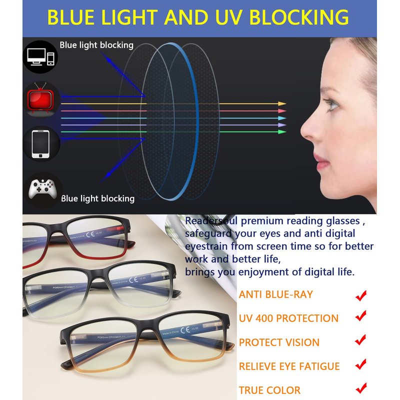 - 【Blue Light Blocker】:Anti Blue Light and Uv400 Lenses Can Filter Harmful Blue Ray & UV Glare. Effectively Block the Radiation Emitted from Computer Screen, Video Games, Phone & TV. Great for Office Workers or Anyone Who Has to Look at Screen All Day. Time to Say Goodbye to Visual Fatigue, Blurred Vision, Dry Eye & Headaches and Enjoy Better Sleep.
