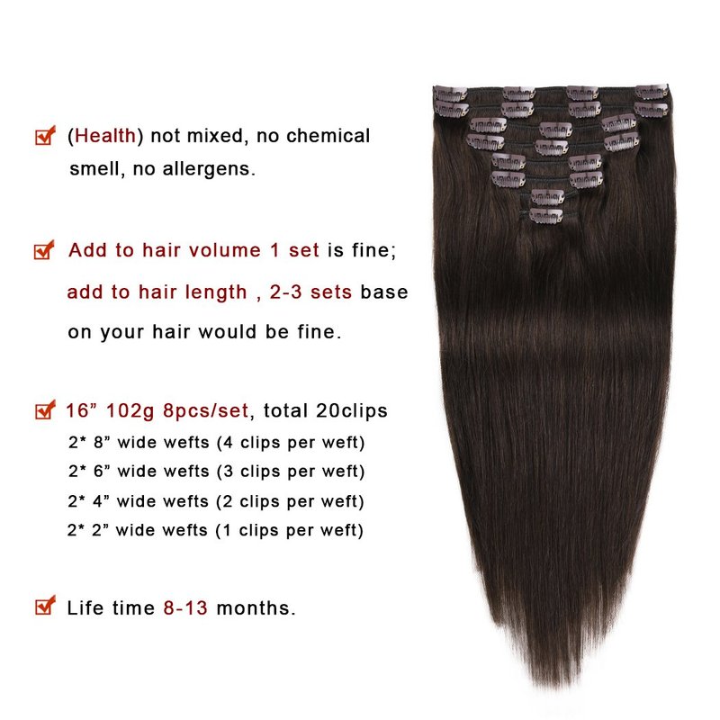 - 【DARK BROWN】Straight Clip in hair extensions #2 is the darkest brown color, If you could not ensure which color to match your hair, you can email pic to us, we will reply you a best advice within 12 hours on business.