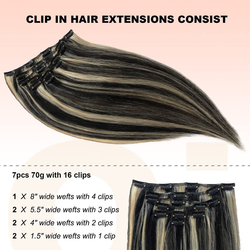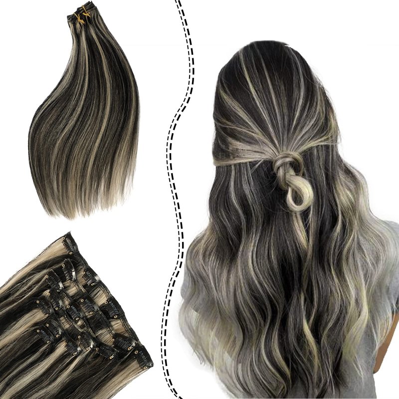 - [HIGHLIGHTS COLOUR]: #1BP24 is a black and honey blonde highlights extensions, with a variety of use scenarios for brides, women, girls and more. The same colour clips for a more invisible and natural look. Note: Light colours can be dyed dark, but dark colours cannot be dyed light.