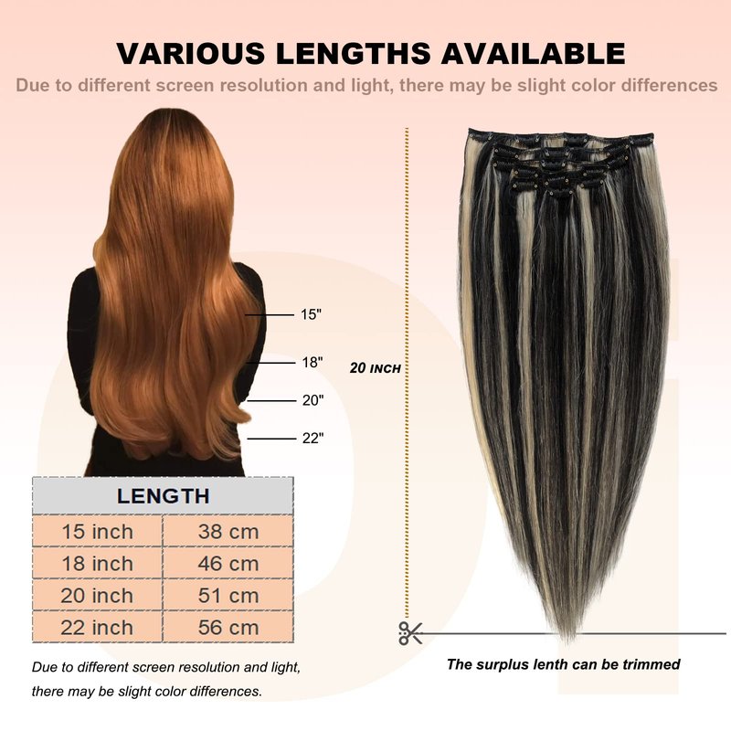 - [CLIP IN EXTENSION SPECIFICATIONS]: 4 different lengths and many colours to choose from, 15" / 18" / 20" / 22", 7 pieces per pack of 70g, 1 piece 8" width weft, 2 pieces 5.5" width weft, 2 pieces 4" width weft and 2 pieces 1.5" width weft. If you like thick hair or you want to lengthen your hair, 2 to 3 sets are recommended to avoid thinning of the ends.
