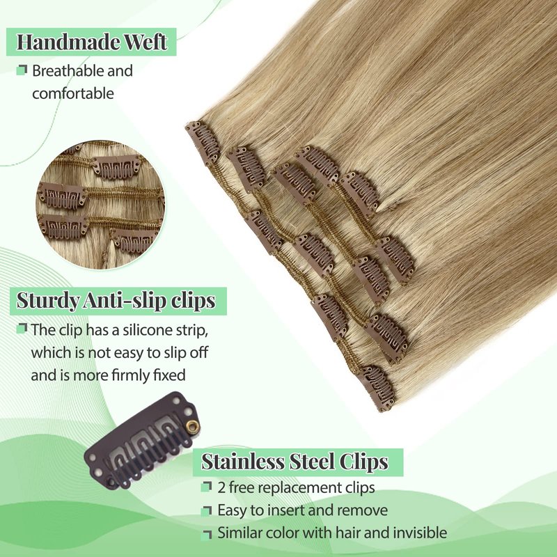 - 【Comfortable & Easy to Wear】- Seamless clip in hair extensions human hair with 12pcs stainless steel clips sewed on. The clips are just the right size, not too large or not too small, and they are covered with rubber to protect your scalp and hair better, will not fall off. There is two extra clips are included in the package as a gift, can be replaced when the clips was broken.