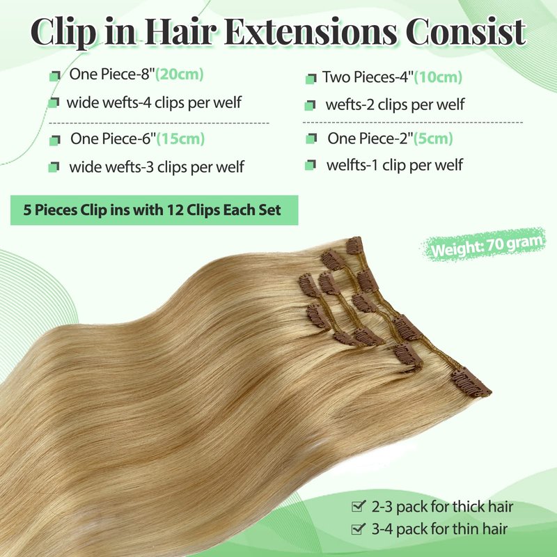 - 【70G 5PCS Clip in Hair Extensions】- Our clip in hair extensions, 5pcs 70g with 12 clips per set, 12-22 inch for choose. The clips is secure enough for your hair, won't fall off. If your hair is thick, 1-2 packs to increase thickness, 2-3 packs to increase length. If your hair is thin, 2-3 packs to increase thickness, 1-2 packs to increase length, 3-4 packs to increase thickness and length. The clip in hair extensions is perfect for various hairstyles, looks like your own hair after clip ins.