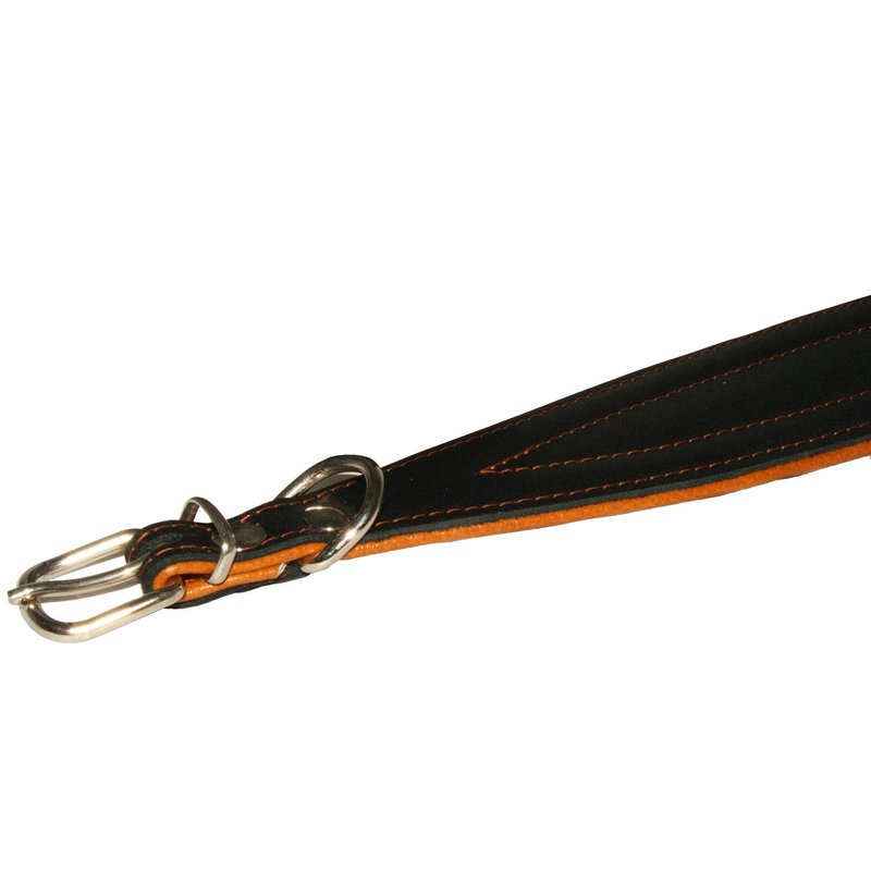 Beautiful and stylish glossy black with fusion of colors dog and puppy collars. Finished off colored stitched seams additionally gives effective visuals. High quality 100% genuine leather top surface. Strong, durable, pliable, and very comfortable dog collar for every day use. Specialized tanned and colored black leather gives unusual and amazing glossy black effect. Very soft 100% genuine leather lining provide soft cushioning feel. Exotic colors give a unique, smooth and elegant look. Features solid nickel plated hardware. 6 available sizes recommended for Greyhound, Saluki, Deerhound, Lurcher, Whippet, Dachshund, and other breeds with similar neck/head structure. Please measure dogs neck to ensure you order the correct size.
