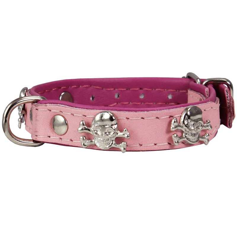Real Leather Skull Studded Padded Dog Collar (6"-7.5" Neck; 1/2" Wide, Pink/Baby-Pink)
