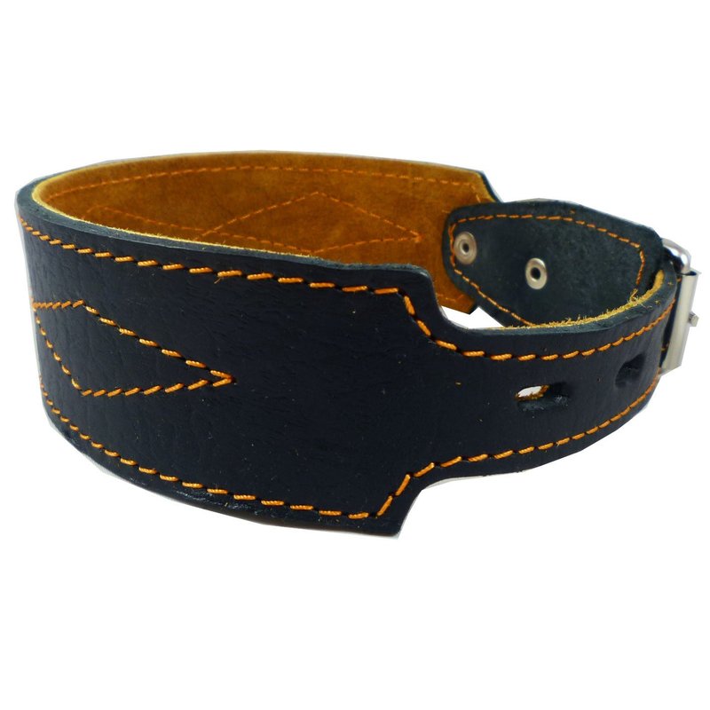 Made of top quality leather, strong and durable this 1.75 inch wide dog collar tapers to 1 inch wide at the buckle for easy buckling. Trimmed with thick waxed thread. Most suitable for Greyhound, Hortaya, Saluki, and other breeds with similar neck/head structure.