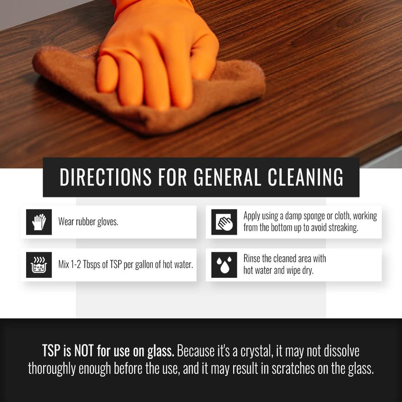 - NOT RECOMMENDED for use on glass surfaces. DO NOT allow TSP solutions to come in contact with glass.