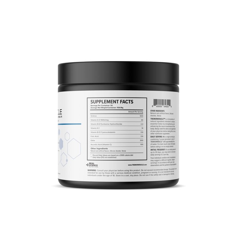 Tremor Miracle natural tremor relief contains vitamins C, D, K, B6, B12 and a proprietary TremorStopTM blend that may effectively support chronic tremor conditions, help calm tremors and enhance absorption.