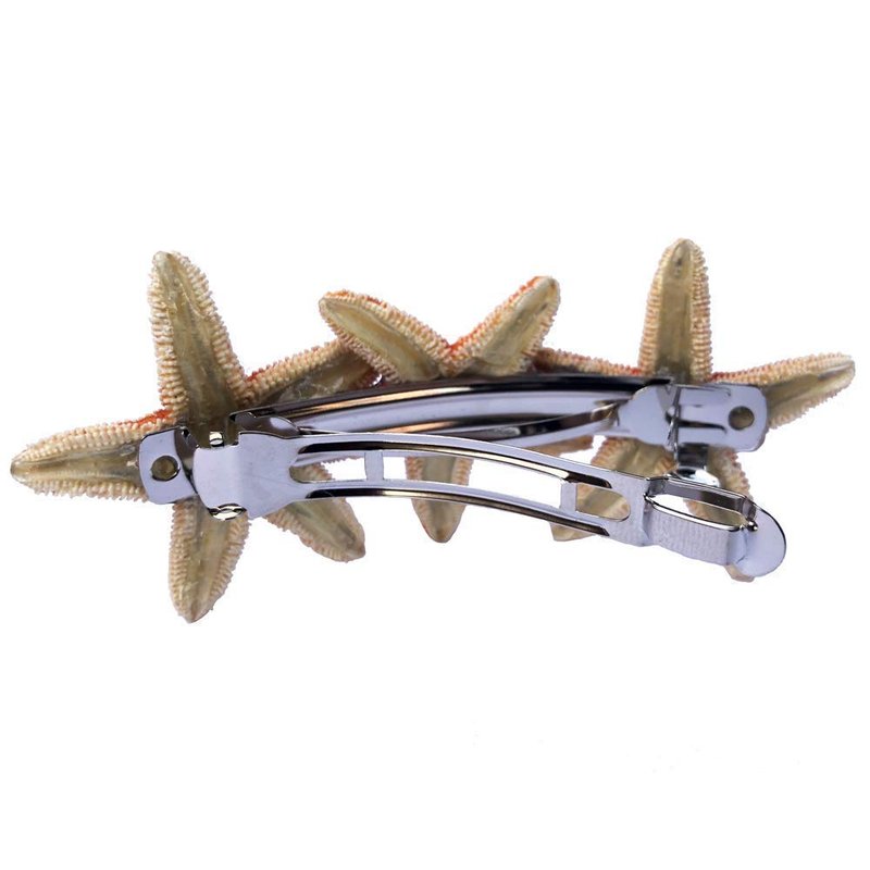 Our gorgeous triple sugar starfish hair barrette is set on a 3 inch french style hair barrette. Though starfish are beautifully delicate, Our starfish are completely filled to ensure durability.