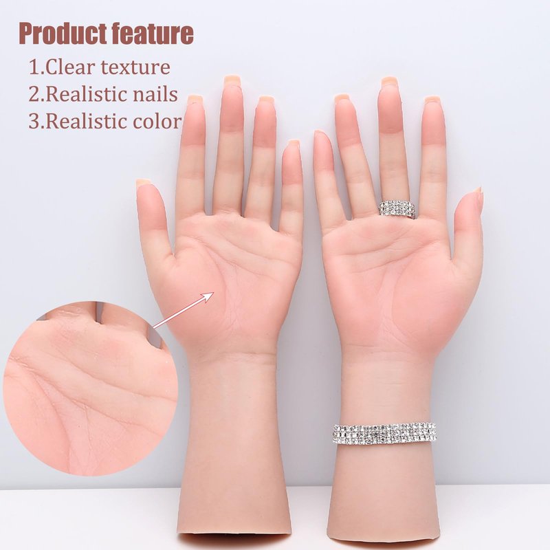 - REALISTIC HAND MODEL:Silicone hand mannequin is made of high quality liquid silicone,very soft and realistic,size and skin texture of practice hand is cloned from real female hand,especially suitable for jewelry displays.
