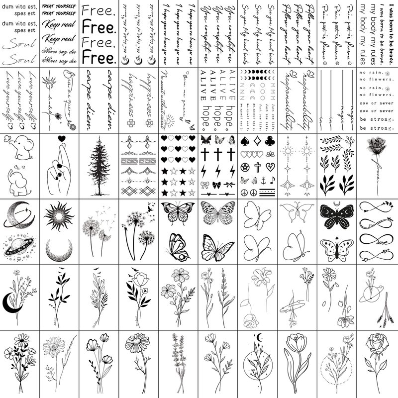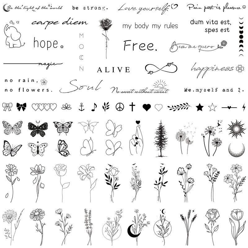 - Cutest Mini teens Tattoos:Each sheet is 6x10 cm (2.3"x3.9") large. This set of bulk 60 sheets includes 20 sheets of inspirational and motivational quotes and scripts style sayings, 20 sheets of simple branch flower tattoos, and 20 sheets of minimalist butterfly,Lavender,rose and dandelion finger tattoos. With such a variety of designs, Express yourself and show off your unique style with these fun and fashionable temporary tattoo stickers!