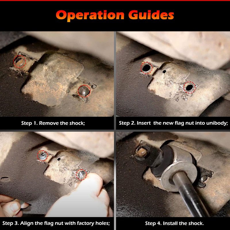- 【Easy Installation】Simply knock out the factory nuts welded in the unibody, slide the bar pin flag nut into the unibody hole, and use the flag nut handle to easily line up your new mounting point within the unibody recess.