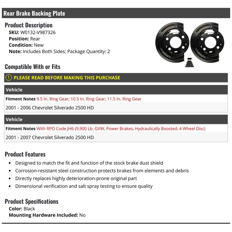 Rear Brake Backing Plate - Compatible with 2001 - 2007 Chevy Silverado 2500 HDPosition: RearNote: Includes Both Sides; Package Quantity: 2Color: BlackCompatible With or Fits: Note: 9.5 In. Ring Gear; 10.5 In. Ring Gear; 11.5 In. Ring Gear - 2001 - 2006 Chevy Silverado 2500 HDNote: With RPO Code JH6 (9,900 Lb. GVW, Power Brakes, Hydraulically Boosted, 4 Wheel Disc) - 2001 - 2007 Chevy Silverado 2500 HD