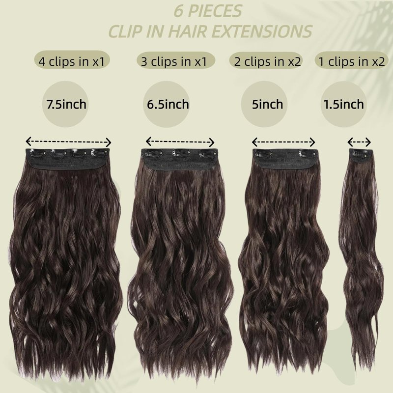 - 【More Volume Wavy Clip in Extensions 】: This hair extensions clip ins include 6 pcs per pack, 220gram weight curly clip in hair extensions for women to add volume, 1 piece of 7.5 inches wide weft with 4 clips, 1 piece of 6.5 inches wide weft with 3 clips, 2 pieces of 5 inches wide weft with 2 clips, 2 pieces of 1.5 inches wide weft with 1 clip, it will meet most user's demands for a full head installation.