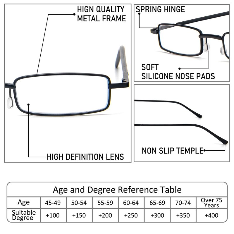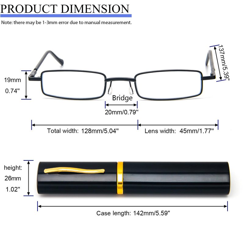 - SLIM COMPACT READERS FITS ANYWHERE YOU GO.Total frame: 4.29 inch,Lense width: 1.44 inch, Lens height: 0.68 inch, Bridge width: 0.72 inch, Arm length: 4.43 inch.Includes shirt clip case for easy storage.Soft plastic pad inside protect your readers from lens scratch.