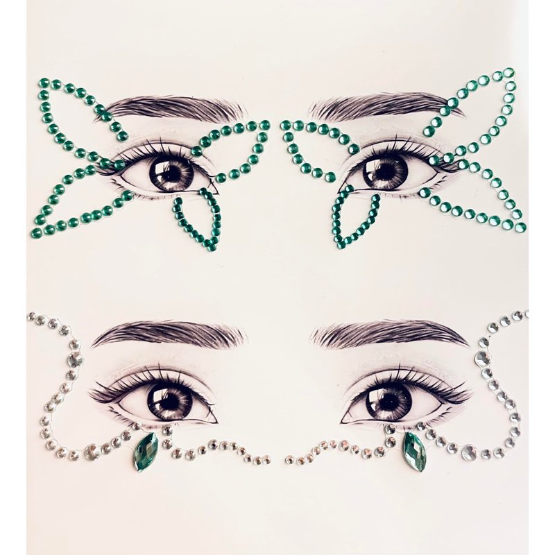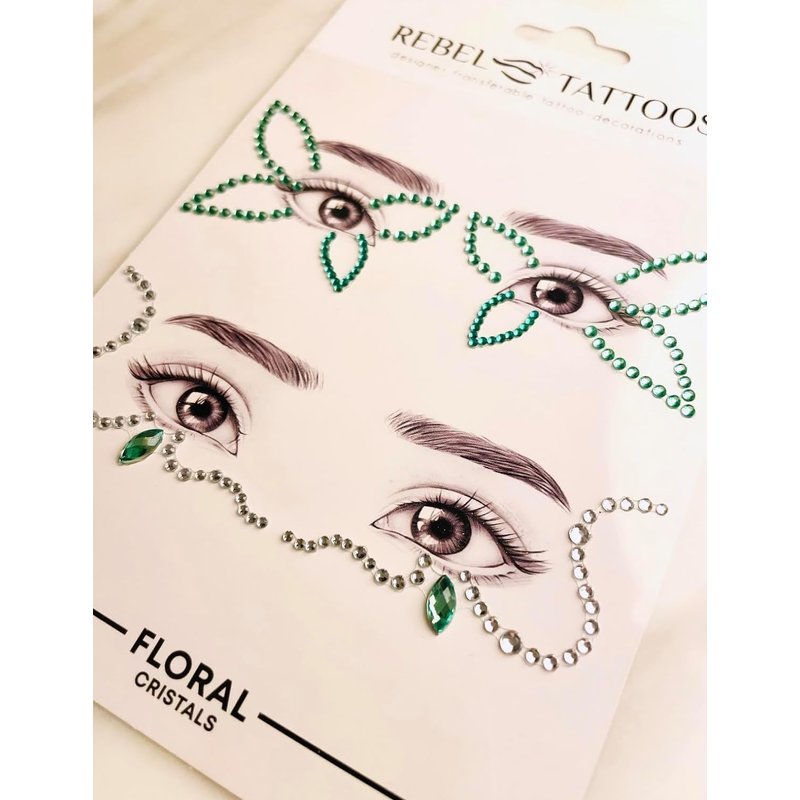 Rebel Tattoos Self-Adhesive Eye Pearls and Face Gems Jewels for Rave Party Festival Makeup, Reusable Multicolor Acrylic Crystal Temporary Tattoo Stickers, Mermaid Face Jewel Eye Stones (Green Floral)