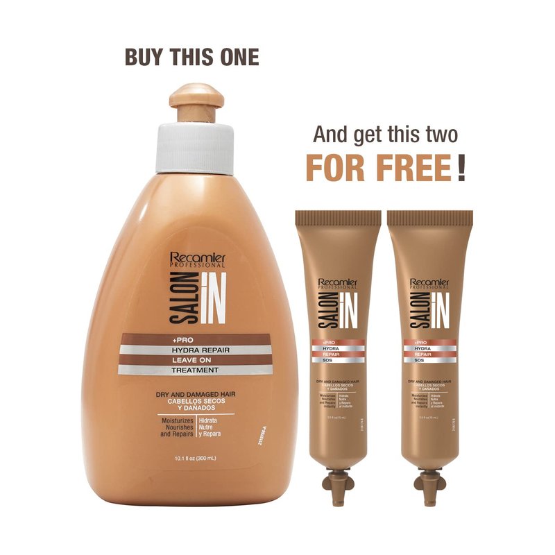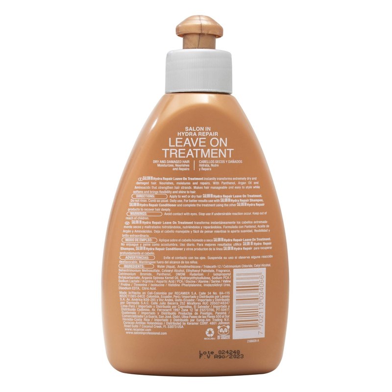 SALON IN Hydra Repair Leave On Treatment instantly transforms extremely dry and damaged hair. Nourishes moistures and repairs. With Panthenol Argan Oil and Aminoacids that strengthen hair strands. Makes hair manageable and easy to style while softens and brings flexibility and shine to hair. SALON IN Hydra Repair SOS is a fluid that instantly moisturizes nourishes and repairs hair improving its texture restructuring critically damaged dry and chemically treated hair Salon In Hydra Repair SOS also covers hair with a protective and hydrating film that protects it from external damage. Salon In Hydra Repair SOS increases after its first use the strength elasticity smoothness and brightness. Salon In Hydra Repair SOS contains: ò Linum Seed Extract: Restores and nourishes the hair giving it extreme shine Keratin: Reconstructive protein that revitalizes nourishes and repairs the hair. ò D³Pantenol: Replenishes the hair with its natural properties hydrating it and making it shiny. It also diminishes split ends. ò Ceramides: Protect the hair against damage caused by external aggression.