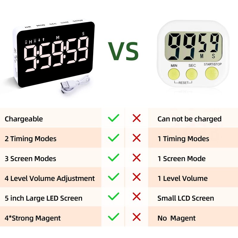 - ✅ Kitchen Timer Digital with 4 levels of adjustable volume: Loud (80-90dB)-a loud alarm is easy to hear even if you are not around; Soft (60-75dB) -children use a soft volume for better hearing protection; Vibrate/Silent-set to vibrate/silent during a meeting or library to remind yourself without disturbing others; the alarm/vibrate/flash will last for 1 minute unless you press any key to pause.