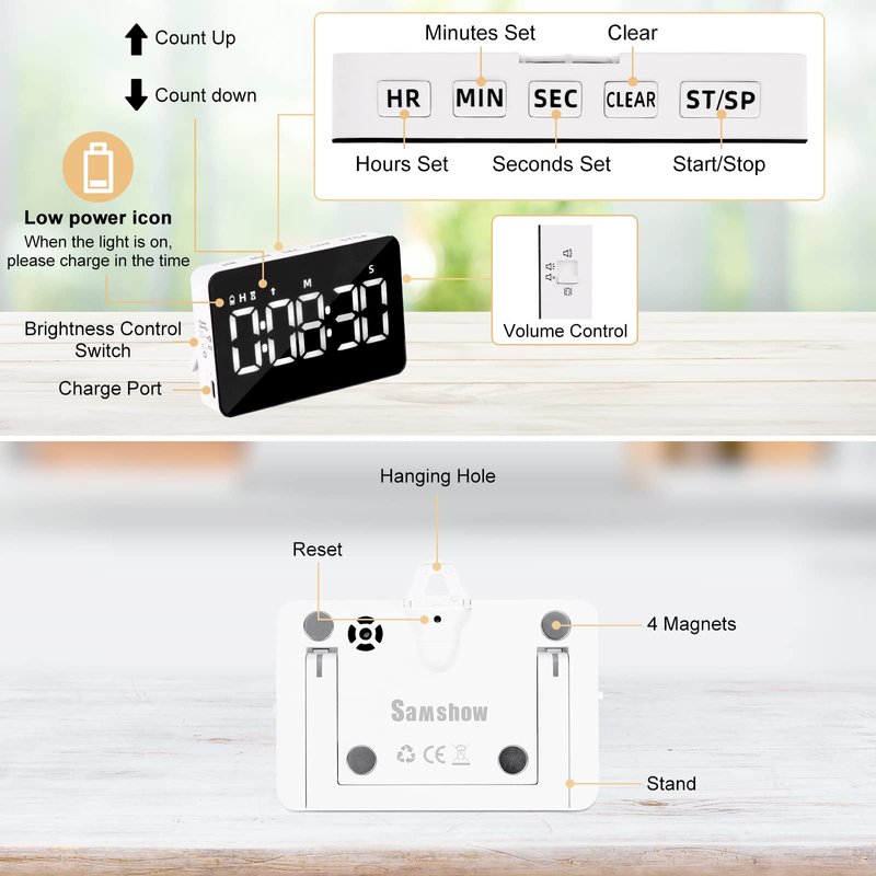- ✅The Magnetic timer is Easy to Use : The countdown timer with regular and simple button settings, children and seniors can easily make it work too! Separate H, M and S button to set the exact time you need, the SP/ST button to start/stop, a CLEAR button is added to makes it much easier to reset. Press and hold H, M or S to quickly adjust to the time you want. When the countdown is up, press any button at the top to pause, and press the ST/SP button again to return to the last set time.