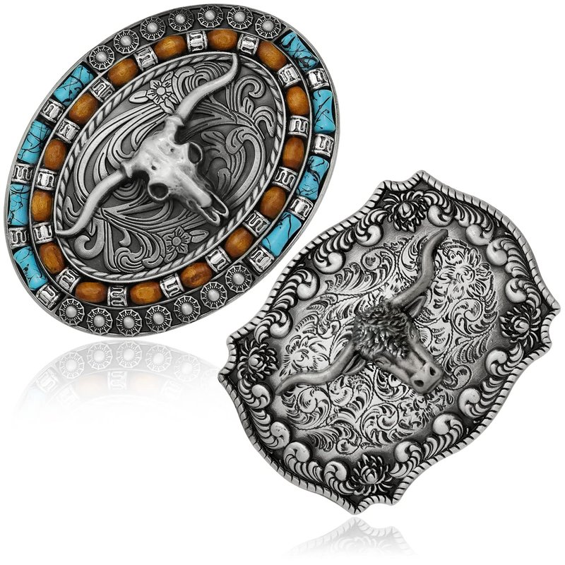 Package includes two different styles of bull head belt buckles, turquoise skull bull head belt buckle and classic longhorn bull belt buckles.