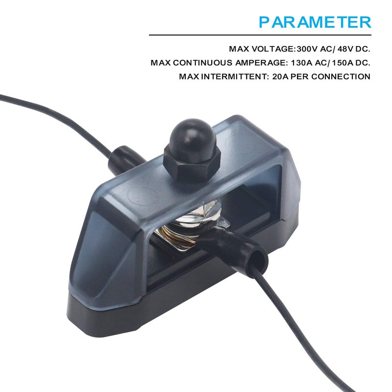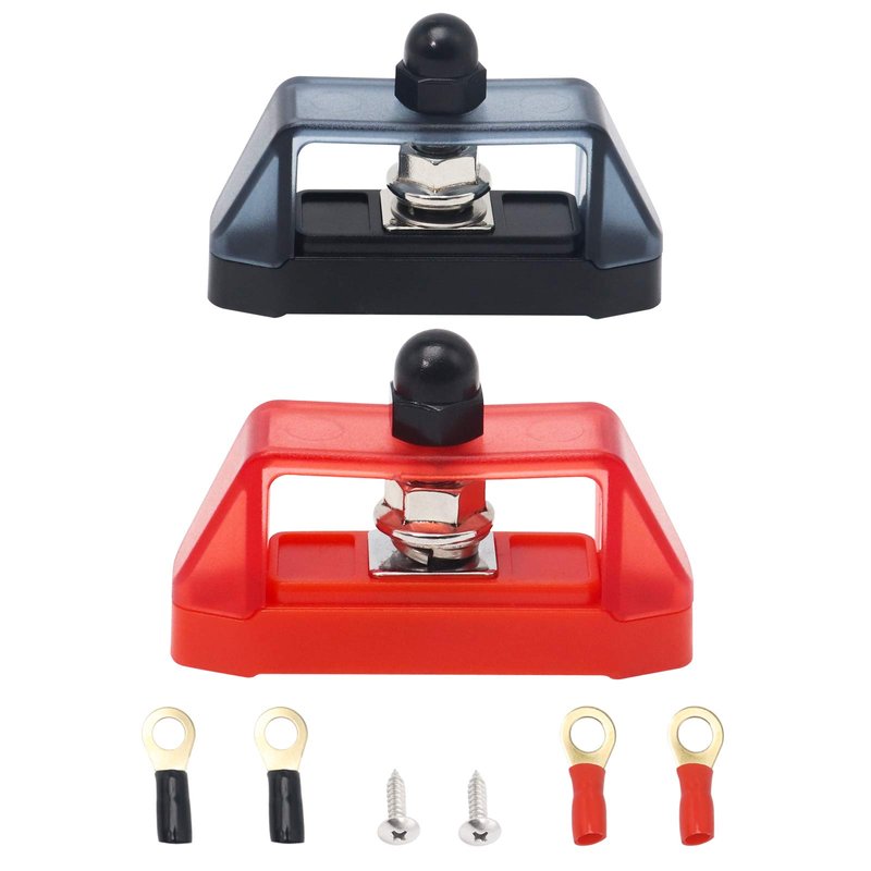 - Single connections with 5/16" stainless steel studs. Comes with 8AWG 5/16” ring terminals and stainless steel screws