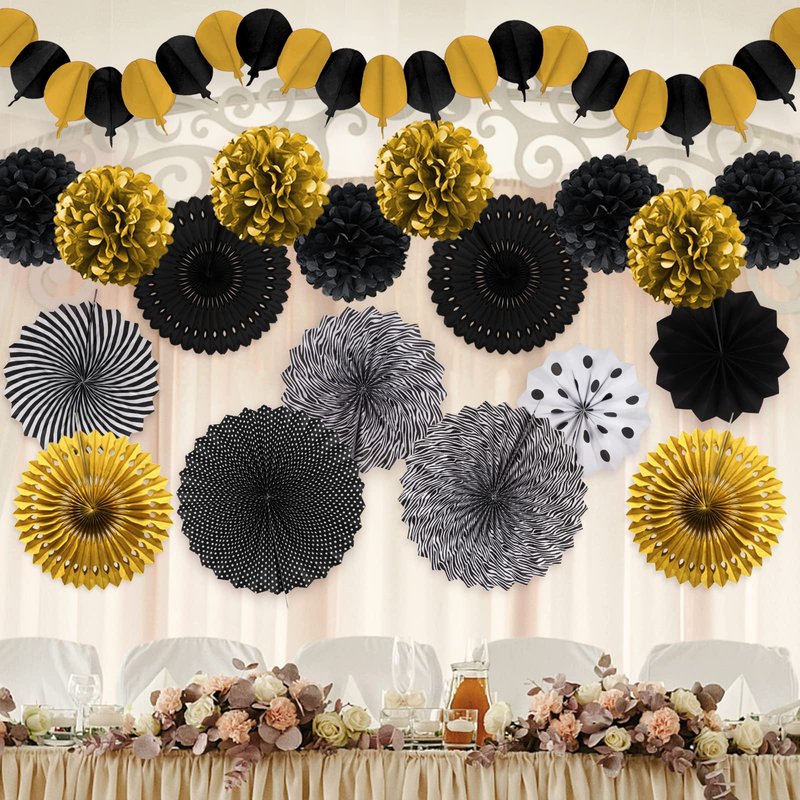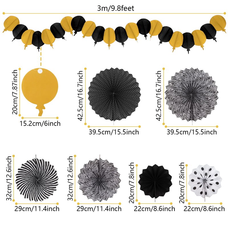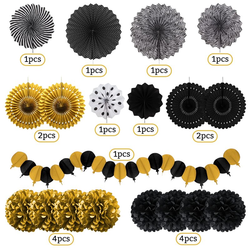 - 【Black Gold Party】6 x paper fans, 8 x paper pompoms, 4 x paper hollow fans, 1 x paper hot air balloon garland( Color: Black and Gold )