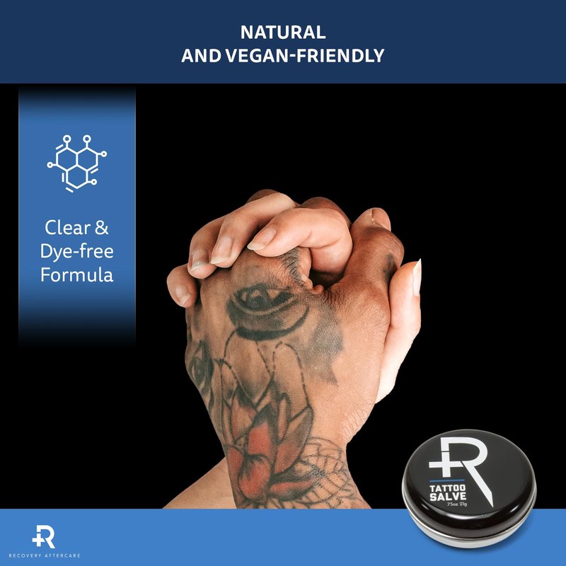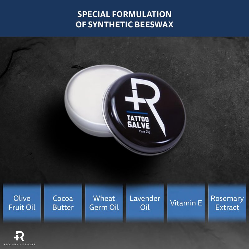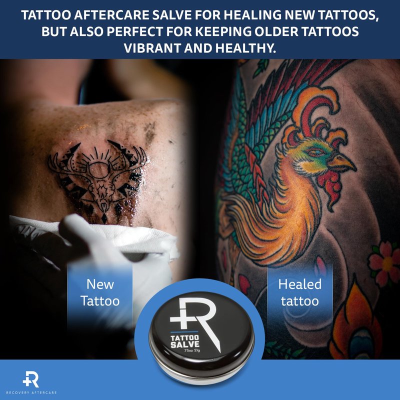 - TATTOO SALVE AFTERCARE – The Recovery Aftercare Tattoo Salve will soothe, moisturize and protect your tattoo and skin. This ointment comes in a convenient .75 ounce tin that easy to take with you on the go.