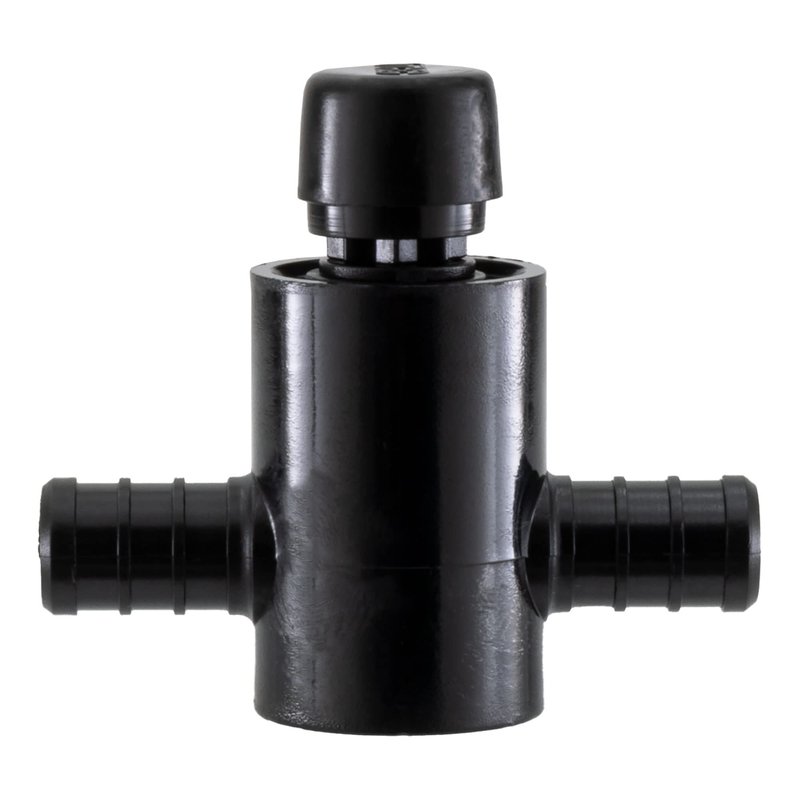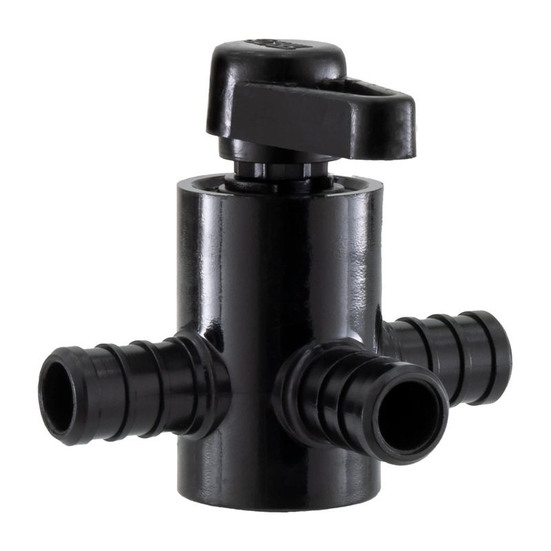 This three-way valve features three ½” barbed connections. The direction the switch points in when the valve is “open” is a constant connection, meaning it always has water flow and functions as a source of water flow for the other two connections. The other two connections are variable connections that allow you to redirect the flow of water from the constant connection.