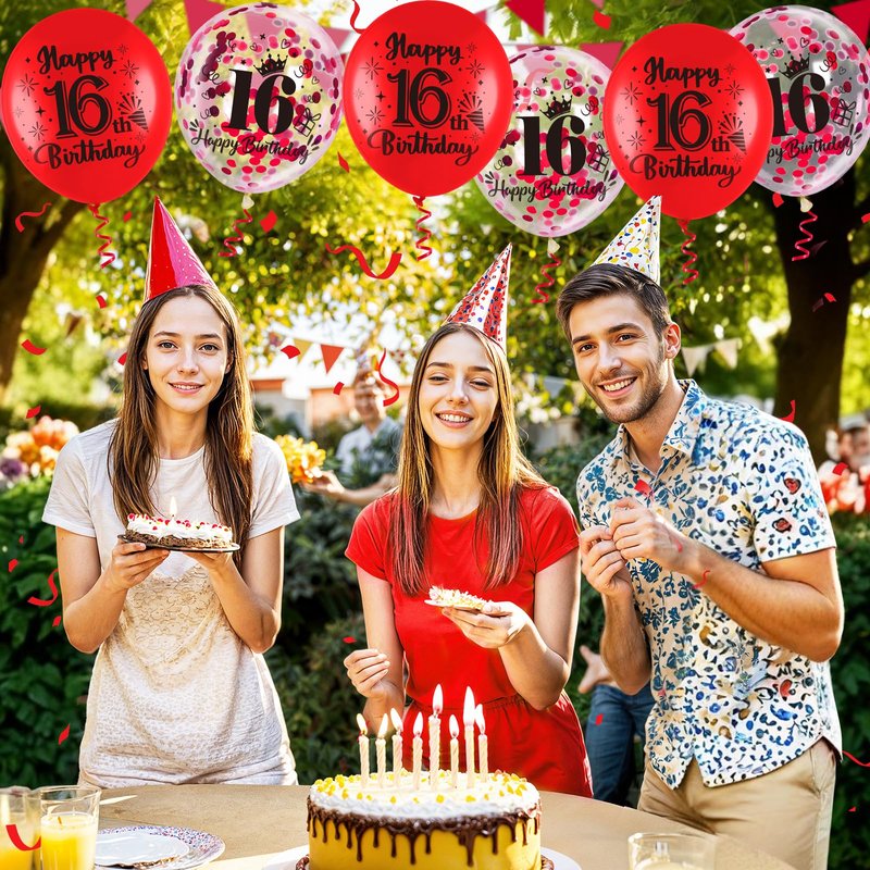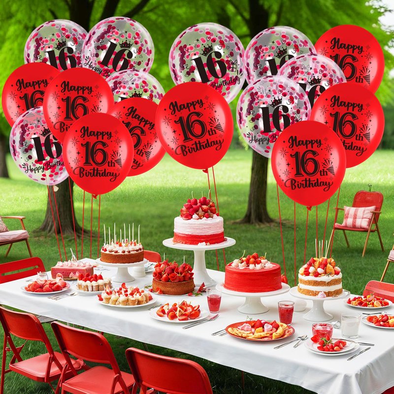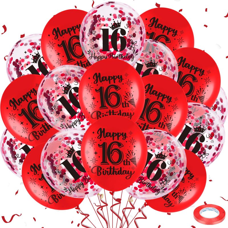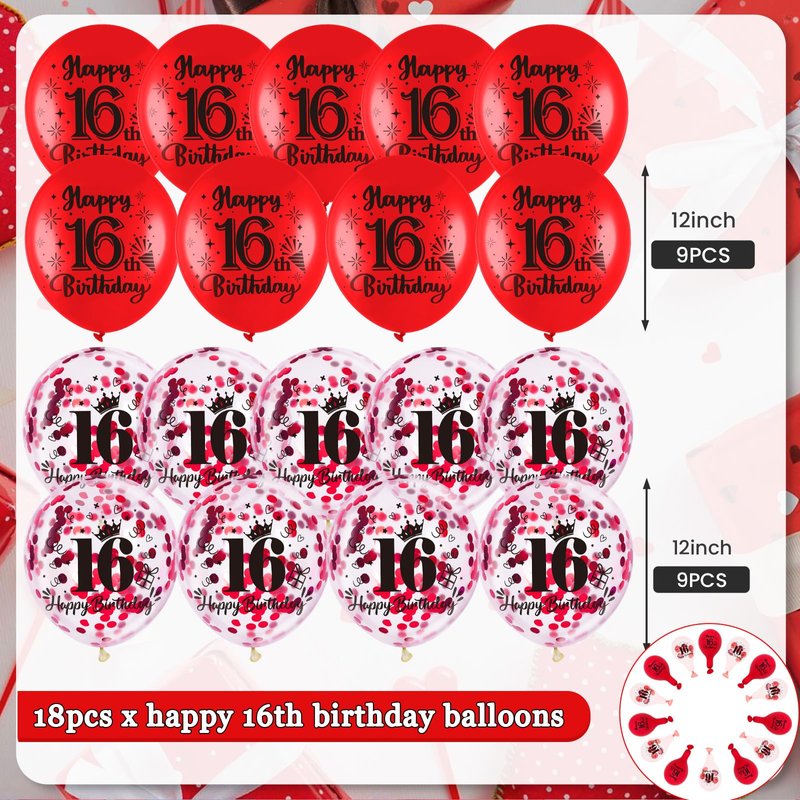 - What You Get:These are such cute, red 16th birthday balloons. The package comes with 9 pcs red 16th birthday latex balloons, 9 pcs 16th confetti balloons, and 1 pc ribbon. A very nice mixture set that compliments each color