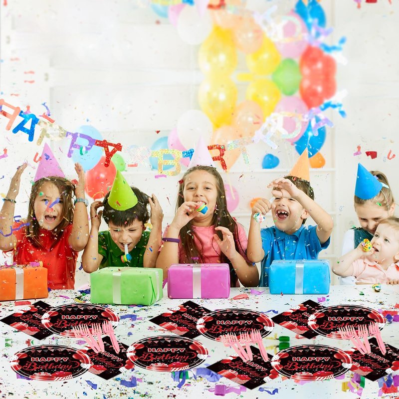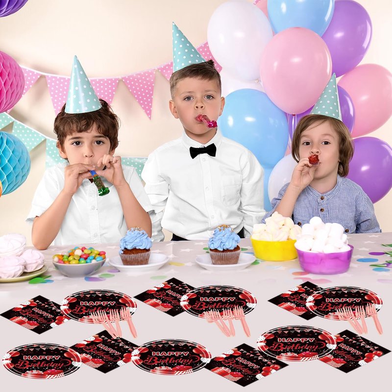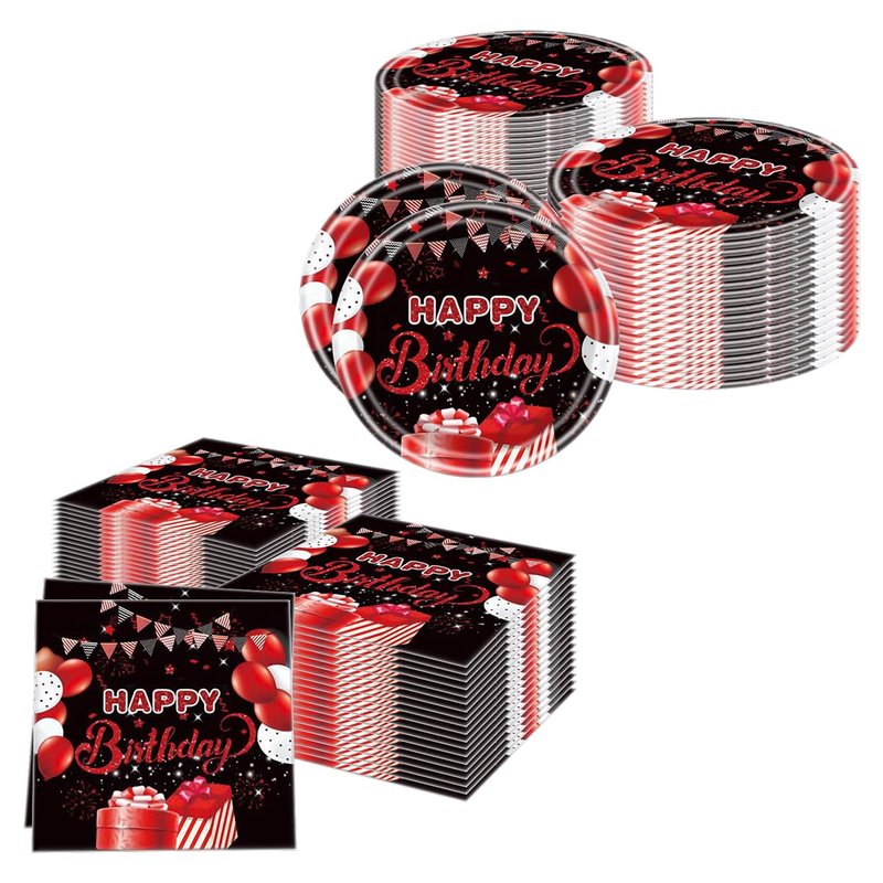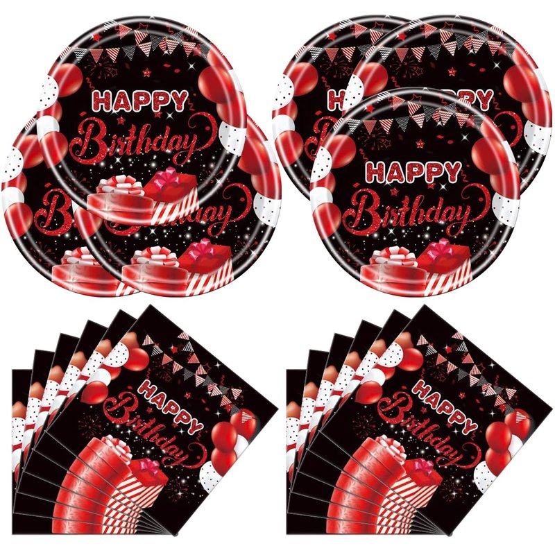 Celebrate your special day in style with this vibrant red and black birthday party tableware supplies set! Featuring 40 pieces of festive decorations, including confetti sprinkles and eye-catching designs with balloons, presents, and the iconic "Happy Birthday" message. This set will add a touch of sophistication and excitement to your party. The bold color combination of red and black creates a striking visual impact that will impress your guests. Whether you're planning a milestone celebration or a casual gathering, this tableware set will elevate the ambiance and make your event truly memorable. With its convenient disposable design, you can enjoy the festivities without worrying about cleanup. Embrace the joy of the occasion and create lasting memories with this delightful birthday party tableware supplies set.
