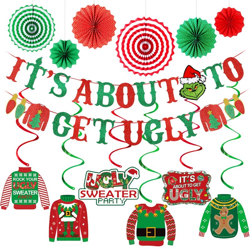 - 【Valuable Pack】You will get 1pcs red and green glitter It's About To Get Ugly banner,6pcs ugly Christmas Sweater hanging swirls and 6pcs red&green paper fan,full of Ugly Christmas feeling.It is a must-have garland to celebrate your Christmas holiday party, brighten up your home party.