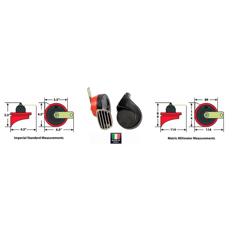 - MADE IN ITALY! Dual ELECTROMAGNETIC Horns. Very compact. Universal Fitment / Relay and 2 Mounting Brackets plus Instructional Installation Diagram Included.