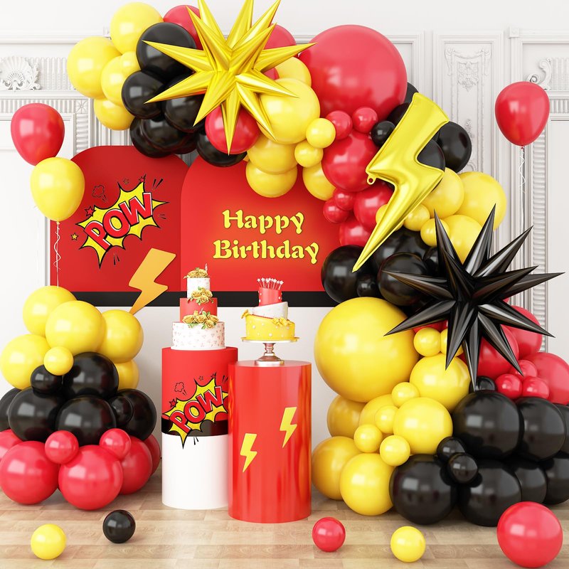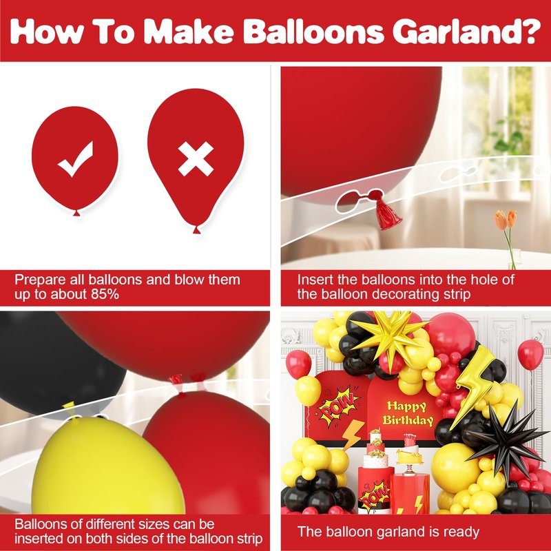 - 【Easy Assembly】Making an impressive red black yellow red balloons garland is a breeze. Simply inflate the balloons to different sizes and easily secure them to the included arched balloon strips using the provided adhesive strips. Mix and match for a truly unique theme party decor.