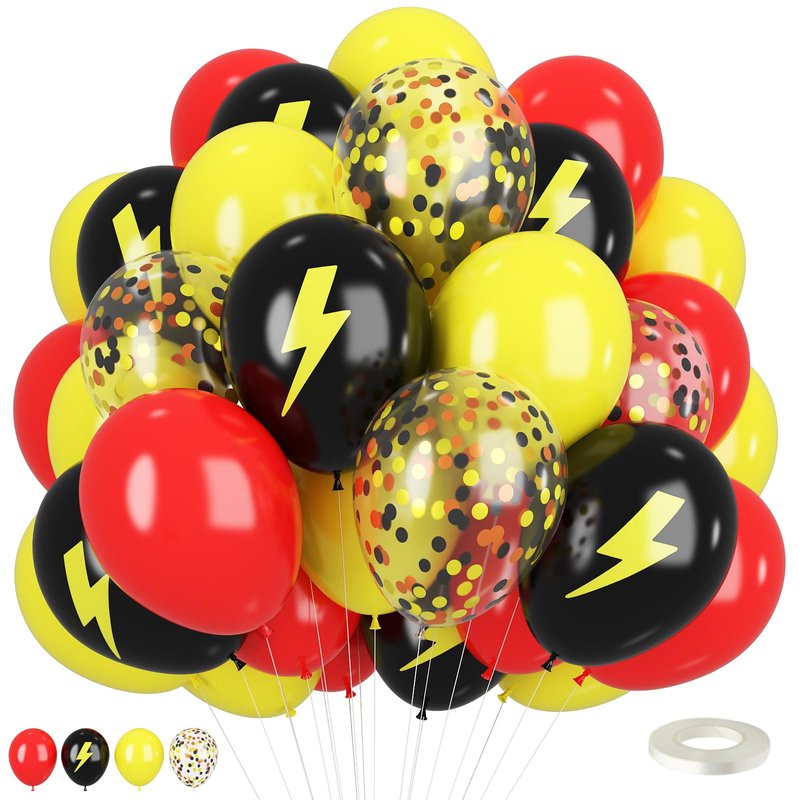 - 12 inch red yellow black balloons: Package contents include red balloons, confetti yellow black balloons, yellow balloons, black lightning printed balloons, a balloon ribbon. The color combination satisfies all your party imagination and starts a wonderful party carnival.