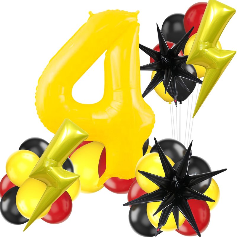 - 【40 Inch Number Balloons】Our balloon kit contains: 1PCS 40inch yellow foil number balloon, 2PCS lightning bolt foil balloons(14.17x33.85in), 2PCS 22inch explosion star foil balloons, 5Pcs 12inch latex black balloons, 5Pcs 12inch latex yellow balloons, 5Pcs 12inch latex red balloons.