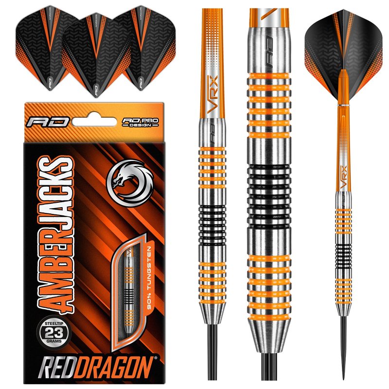 Set of 3 x 23g - 90% premium quality Red Dragon tungsten darts; Red Dragon stems; Red Dragon Hardcore flights; Amberjacks are distinguished by their distinctive black and orange styling; Amberjacks are also available in 21g, 22g, 23g, 24g, 25g, 26g, 27g, 28g or 30g weights