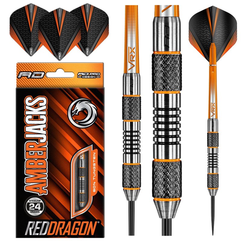 Set of 3 x 24g - 90% premium quality Red Dragon tungsten darts; Red Dragon NitroTech stems; Red Dragon Hardcore flights; Amberjacks are distinguished by their distinctive black and orange styling; Amberjacks are also available in 21g, 22g, 23g, 24g, 25g, 26g, 27g, 28g or 30g weights