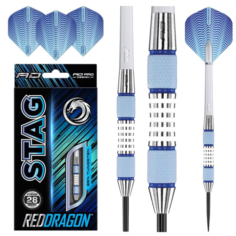 Set of 3 x 28g - 85% premium quality Red Dragon tungsten darts; Red Dragon stems - Designs may vary; Red Dragon flights; Stags are made with precision grip and finished in striking blue, white and grey; Stag are available in 21g, 24g, 25g, 26g, 27g, 28g, 29g & 30g weights